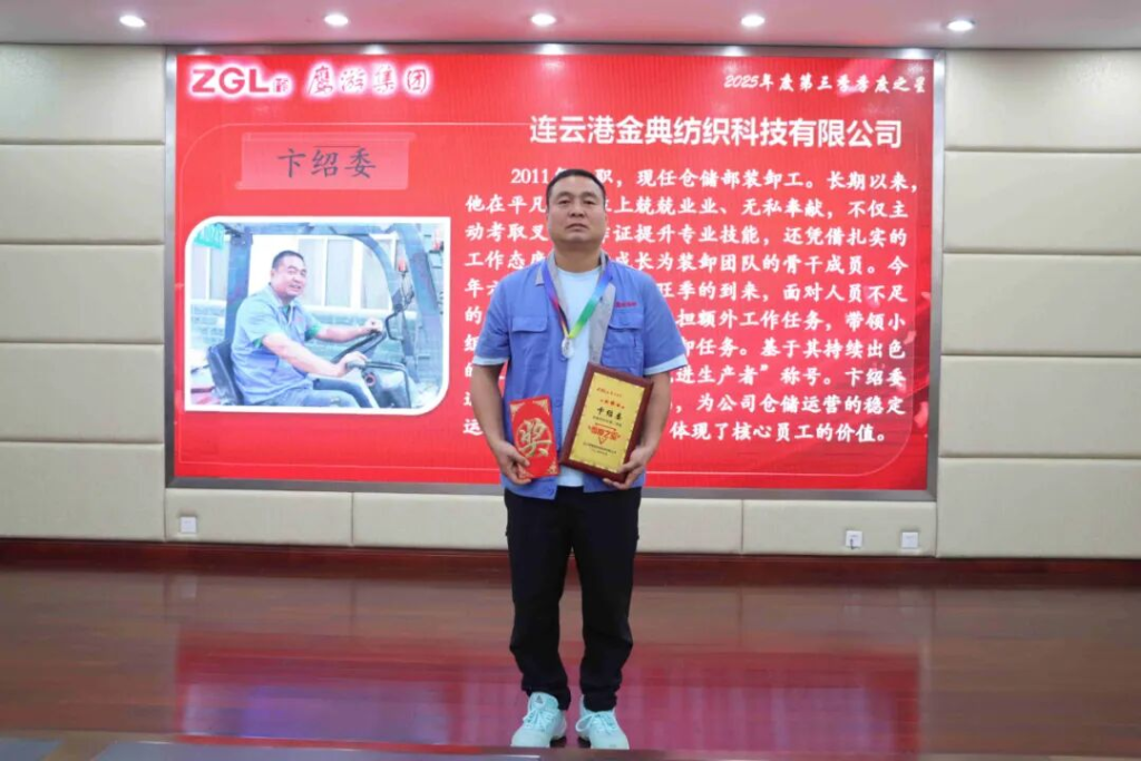 卞紹委,2011年加入金典紡織科技公司,現(xiàn)任倉儲部裝卸工。他積極進取,主動考取叉車操作證,提升專業(yè)能力,逐步成長為裝卸團隊的骨干。工作中,主動承擔額外任務,帶頭攻堅,帶領小組高效完成繁重裝卸工作,每日加班無怨無悔,有力保障了生產連續(xù)性,體現(xiàn)出顯著的模范帶頭作用。因其持續(xù)出色的表現(xiàn),多次獲評“先進生產者”稱號。